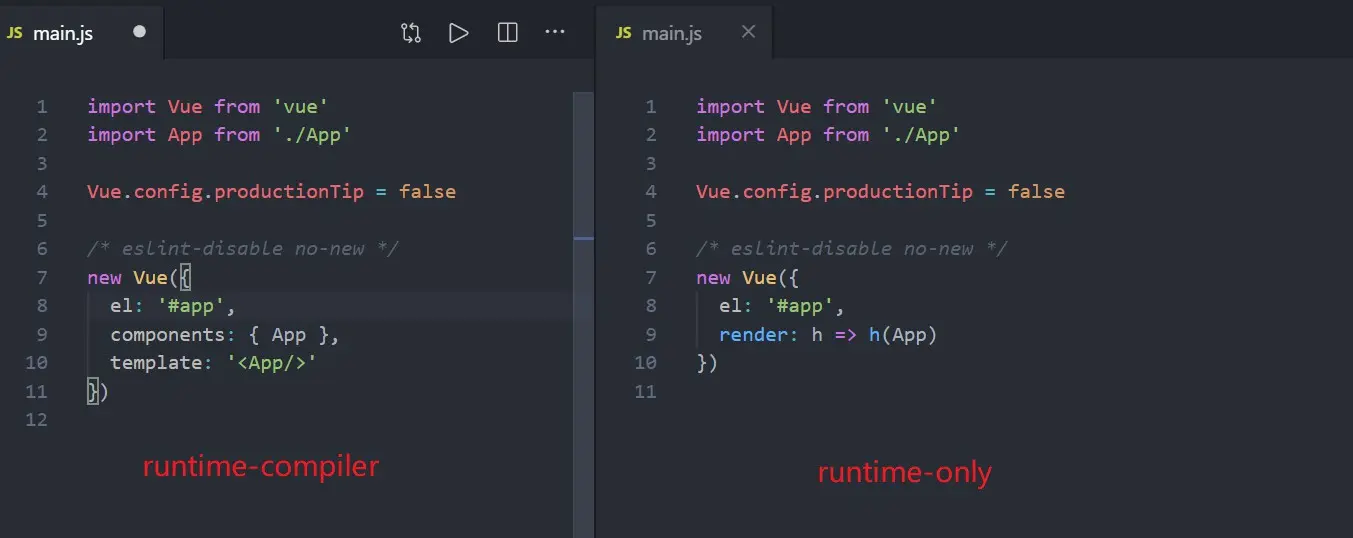 区别很明显,在 Vue 实例中,runtime-compiler 创建的项目中的参数是 components 和 template,而在 runtime-only创建的项目中,参数是 render函数,这是他们最大的区别