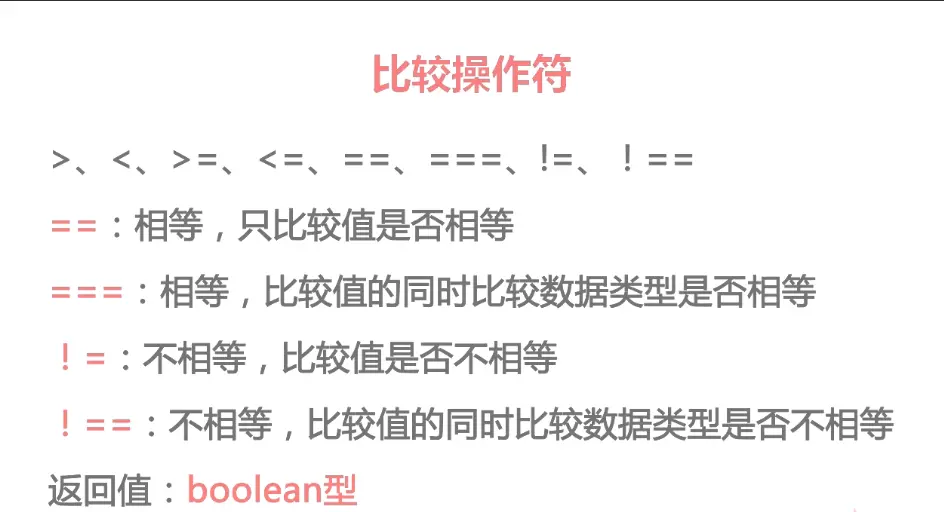 两个等号表示两者之间值是否相等,三个等号表示值相等的同时,变量类型是否相等,返回值为Boolean,即真或假,不等的情况与等于同理