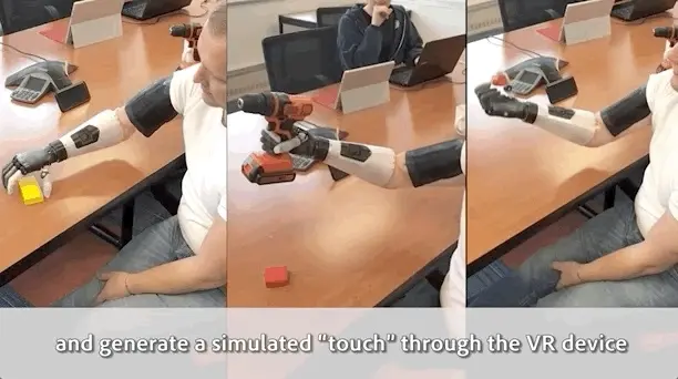 第二个实验中,是一位下臂截肢的男人,上臂上贴上片,用一个有机械手的假肢抓住物体的时候,感受到了自己的确是在用手抓住物体。