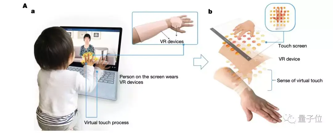 在第一个实验中,是一个女孩和祖母进行视频通话的场景,她只需要触摸屏幕,祖母就能够通过手臂上的设备感知到了孙女的抚摸。