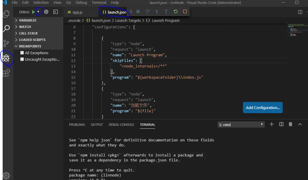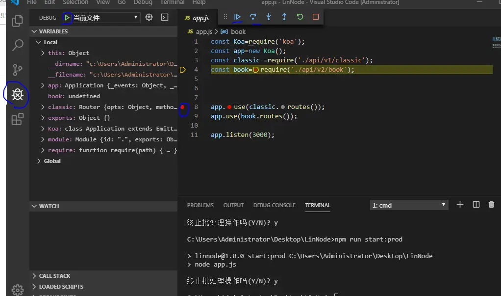 切换到项目目录,点击app.js然后点击小爬虫,点击绿色按钮且在app.js文件打上断点,运行后看到如下