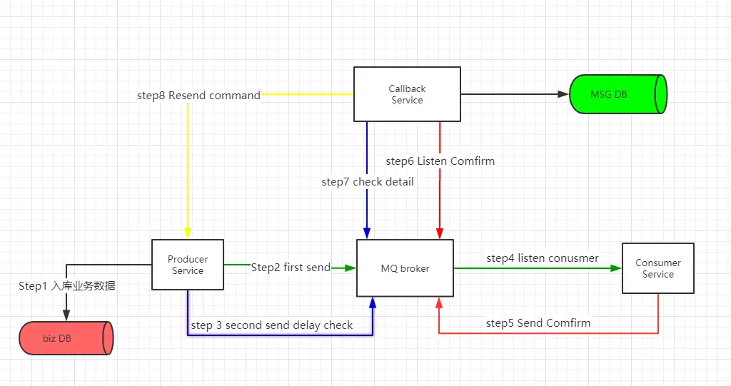 checkdetailQueue,并去MSG DB查询该消息是否被成功消费 - 若查询不到check message,则CallbackService向ProducerService发送RPC请求,让其重发消息,设置重发次数,达到重发次数后,设置其为消费失败