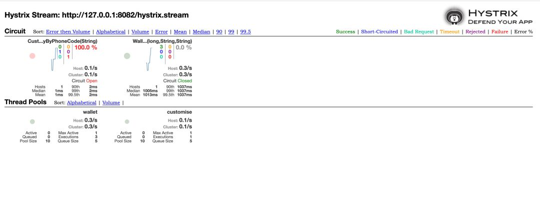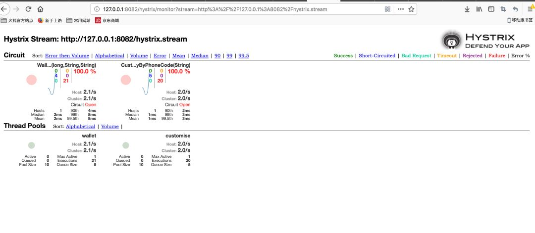 以上模式就是在Spring Cloud中通过FeignClient调用时,在开启Hystrix熔断功能后的基本处理套路了。接下来,我们通过具体的测试效果,来看下熔断器功能的生效情况: