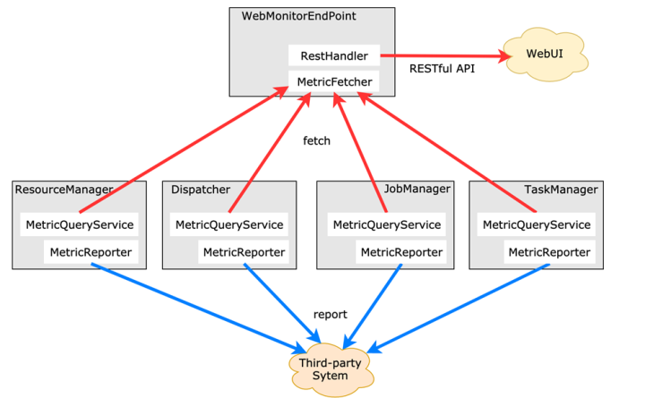红色的路径通过 MetricFetcher,会有一个中心化的节点把它们聚合在一起展示。而 MetricReporter 不一样,每一个单独的点直接汇报,它没有中心化节点帮助做聚合。如果想要聚合,需要在第三方系统中进行,比如常见的 TSDB 系统。当然,不是中心化结构也是它的好处,它可以免去中心化节点带来的问题,比如内存放不下等,MetricReporter 把原始数据直接 Reporter 出来,用原始数据做处理会有更强大的功能。