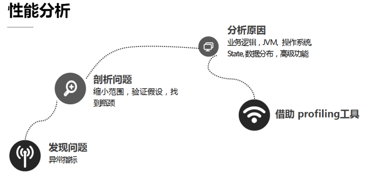 首先从发现问题开始,如果有 Metrics 系统,再配上监控报警,就可以很快定位问题。然后对问题进行剖析,大盘看问题会比较方便,通过具体的 System Metrics 分析,缩小范围,验证假设,找到瓶颈,进而分析原因,从业务逻辑、JVM、 操作系统、State、数据分布等多维度进行分析;如果还不能找到问题原因,就只能借助 profiling 工具了。