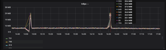 500 个 InBps 都具有 256 个 PARALLEL ,这么多个点不可能一一去看,因此需要在聚合时把 index 是第几个并发做一个标签。聚合按着标签进行划分,看哪一个并发是 100%。在图中可以划分出最高的两个线,即线 324 和线 115,这样就又进一步的缩小了范围。