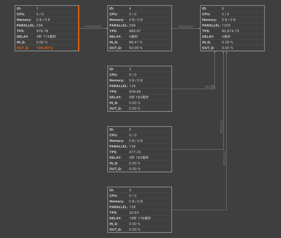 当出现一个地方比较慢,但是不知道哪里慢时,如下图红色部分,OUT_Q 并发值已经达到 100% 了,其它都还比较正常,甚至优秀。到这里生产者消费者模型出现了问题,生产者 IN_Q 是满的,消费者 OUT_Q 也是满的,从图中看出节点 4 已经很慢了,节点 1 产生的数据节点 4 处理不过来,而节点 5 的性能都很正常,说明节点 1 和节点 4 之间的队列已经堵了,这样我们就可以重点查看节点 1 和节点 4,缩小了问题范围。