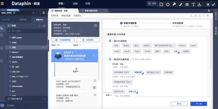 不同于传统标签生产,Dataphin数据萃取的用户只需要关心标签的具体业务含义和规则,而不用关心底层算法的实现,通过简单的界面操作即可完成标签的配置,并自动生成代码和周期调度任务,极大程度上降低了标签生产的难度和门槛。