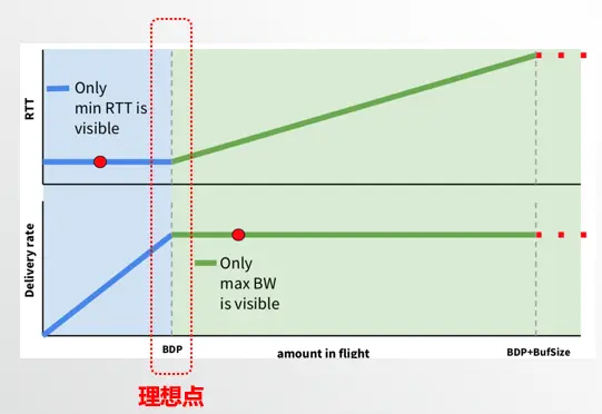图中红色虚线框所标识的就是理想情况下最大带宽和最小延时。很明显,要找到BDP, 很难在同一时刻找到最小的RTT和最大带宽。这样最小RTT和最大带宽必须分别探测。