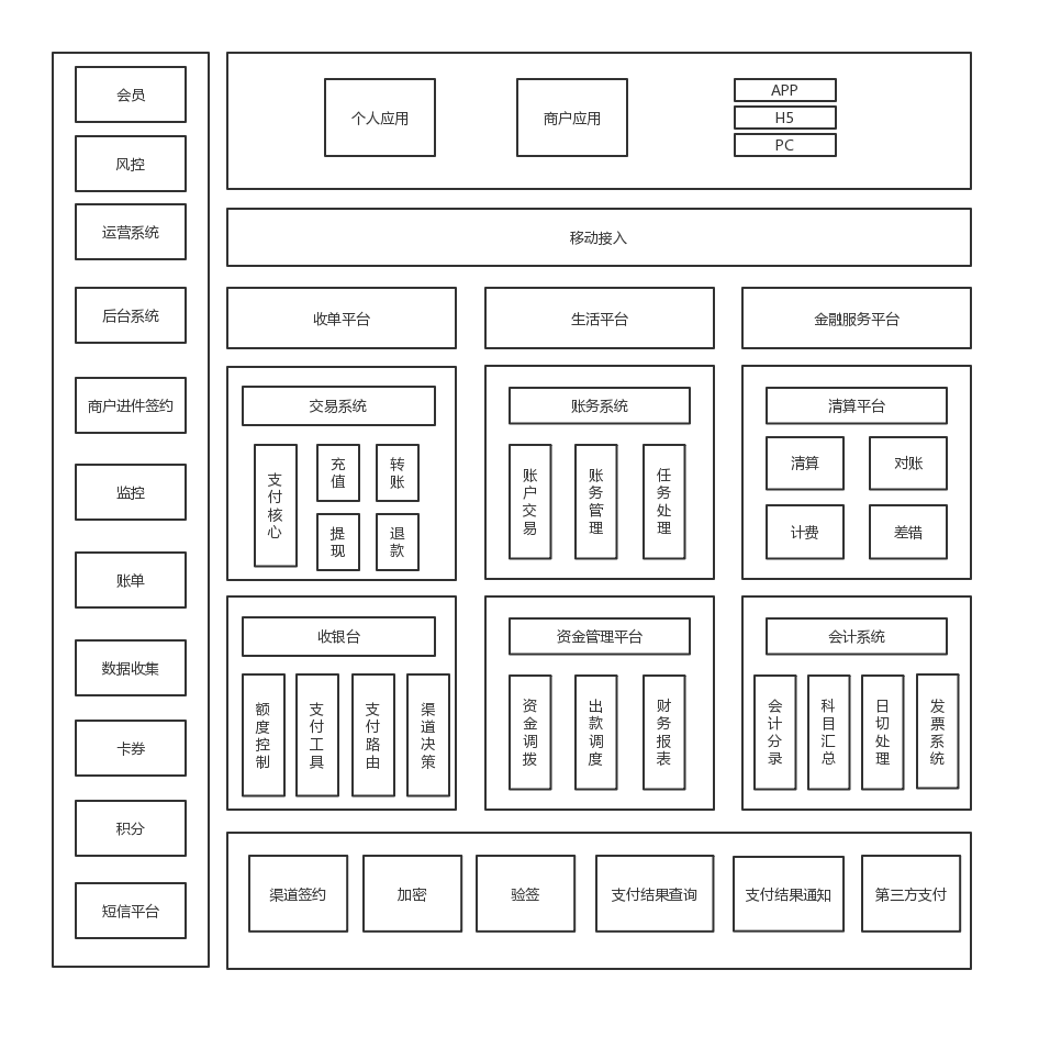 面向支付业务的话:交易核心、收银台、支付核心、渠道网关