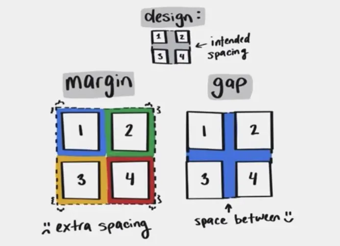 以往我们做列表的时候, 要控制元素到其他元素的间距, 往往使用的是margin, 利用的是外边距重叠的特性,这就是图中的 extra spacing, 而现在有了gap, 我们就有了更优雅的解决办法:
