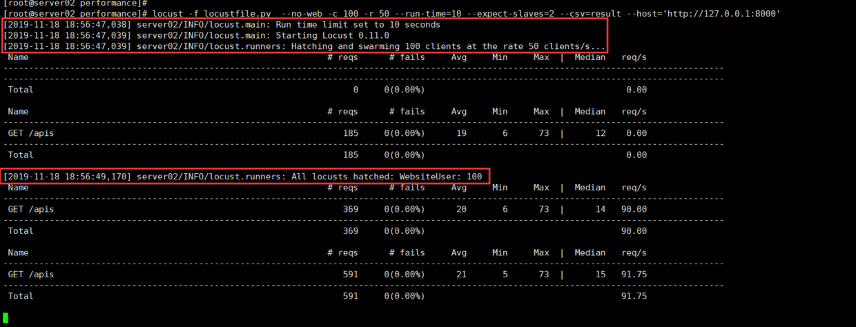locust -f locustfile.py --no-web -c 100 -r 50 --run-time=30 --expect-slaves=2 --csv=result --host='http://127.0.0.1:8000' --logfile=locust.log --loglevel=INFO 1>run.log 2>&1