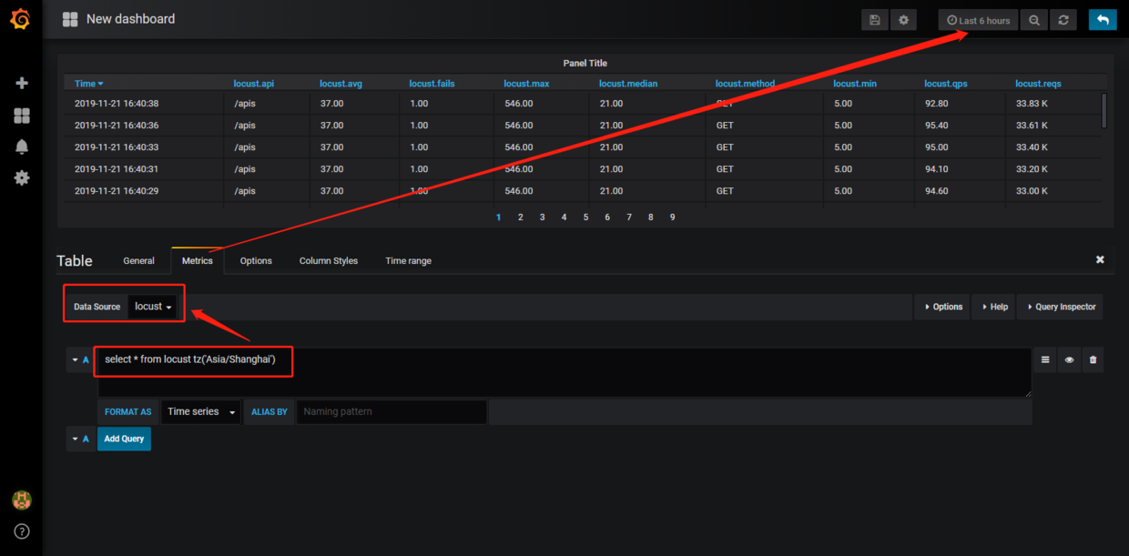 将查询语句直接写入查询框中,然后选择数据库(我前面已经设置好,这里就不展示了),最后设置查询的时间,就可以看到数据展示了。