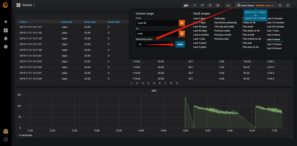 1、首先将locust执行过程的日志写入文件中 2、通过读取执行文件的日志信息,再将其转化存储到influxdb数据库 3、最后根据influxdb数据库的数据,展示图表