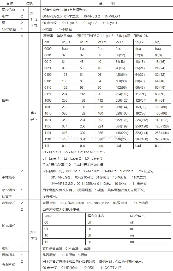 - Layer2/3:Len(字节) = ((每帧采样数/8*比特率)/采样频率)+填充