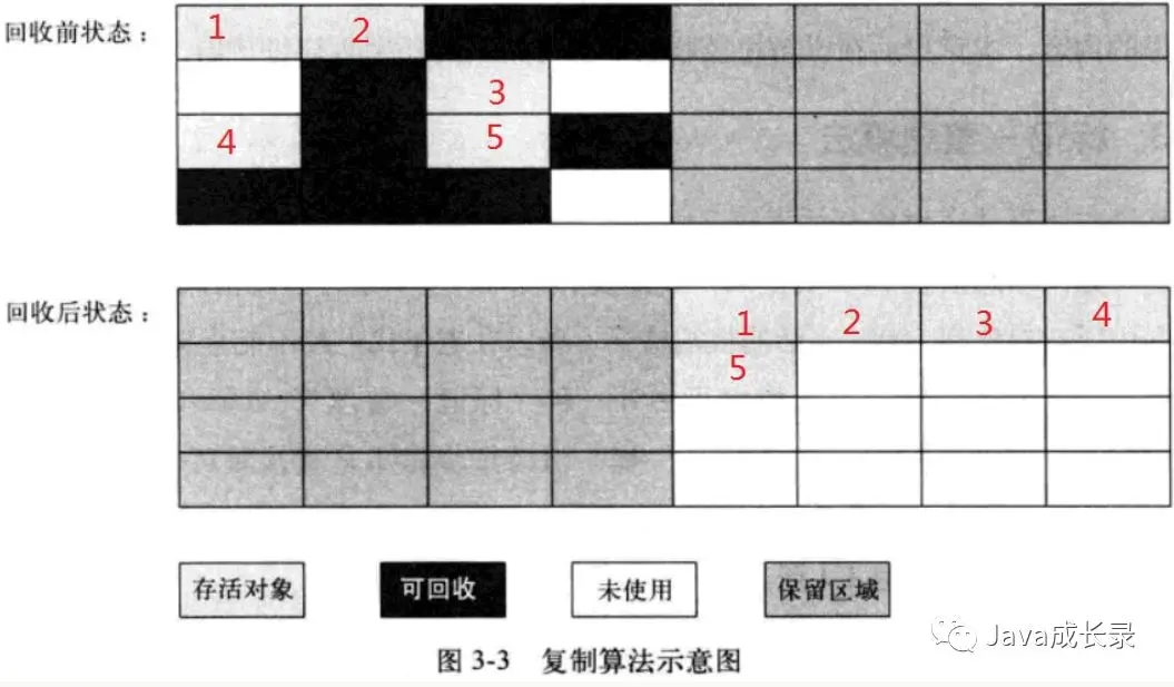 将可用内存分为两等份,每次使用其中一份,进行垃圾回收的时候将,存活对象复制到另一块没有使用的可用空间上面,然后把使用过的内存空间一次性全部清理。