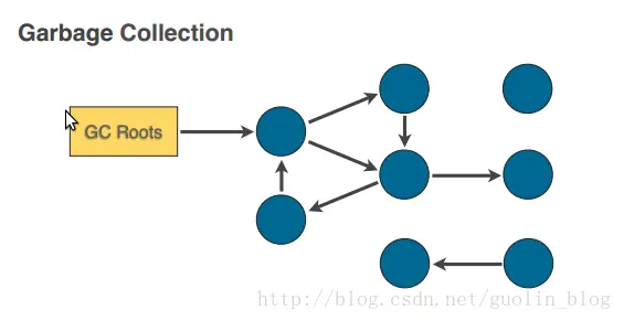 上图当中,每个蓝色的圆圈就代表一个内存当中的对象,而圆圈之间的箭头就是它们的引用关系。这些对象有些是处于活动状态的,而有些就已经不再被使用了。那么GC操作会从一个叫作Roots的对象开始检查,所有它可以访问到的对象就说明还在使用当中,应该进行保留,而其它的对象就表示已经不再被使用了,如下图所示: