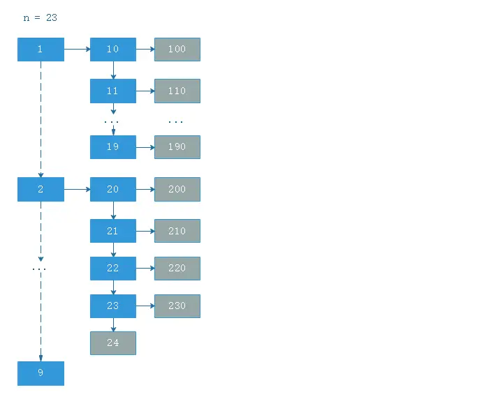 给定 n =1 3,返回 [1,10,11,12,13,2,3,4,5,6,7,8,9] 。