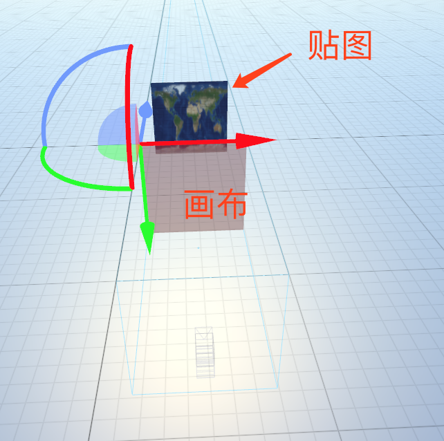 如下图,贴图是 1x1 的方块,画布也是 1x1 的方块,位于贴图前面,它的坐标原点在左上角,x 轴指向右侧,y 轴指向下方,z 轴指向屏幕内::