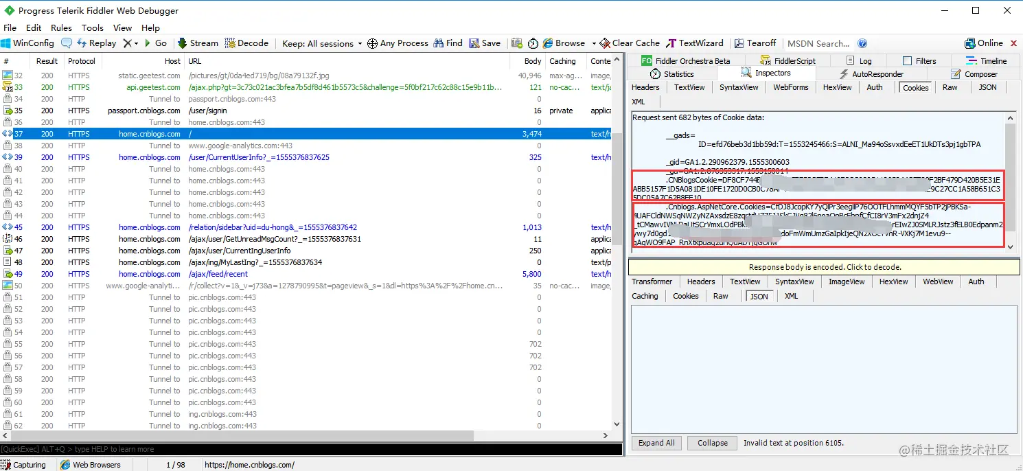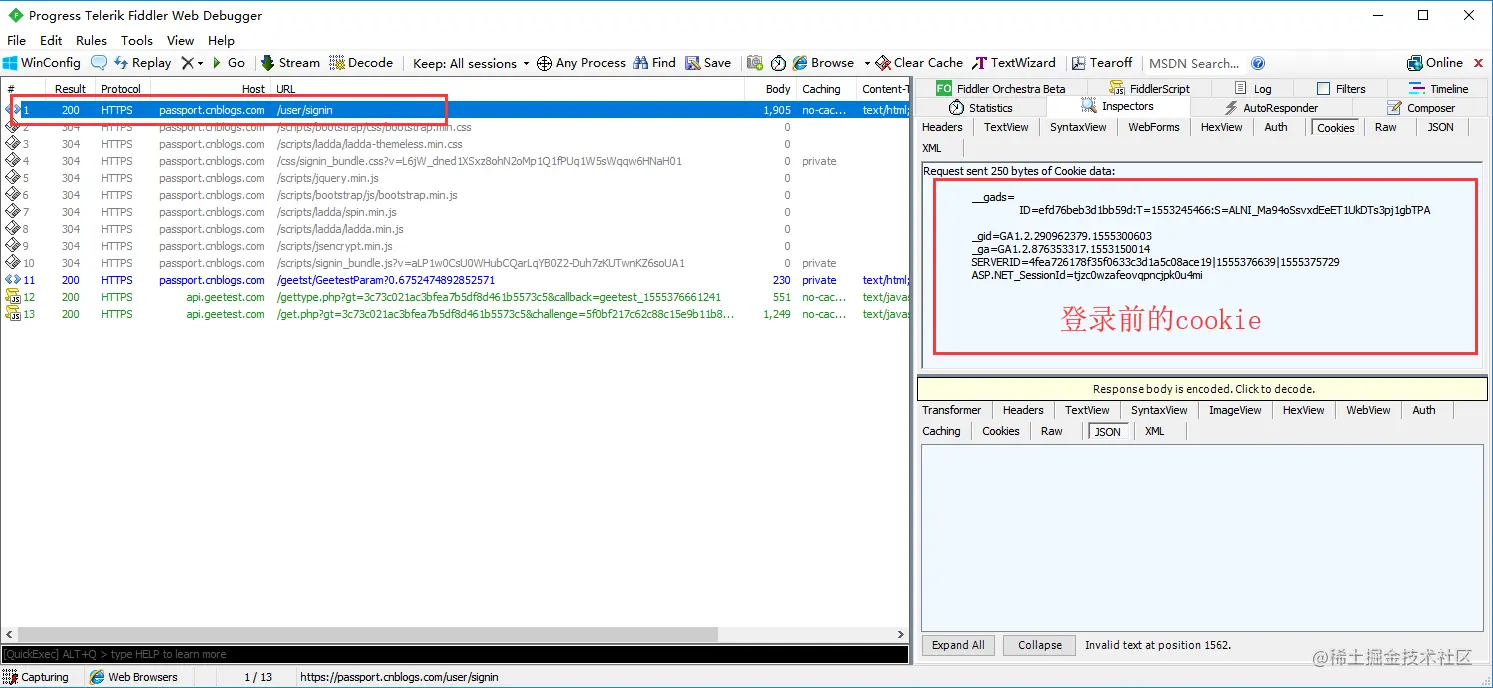 2、可以先手动登录一次,然后抓取这个cookie,这里就需要用抓包工具fiddler了
