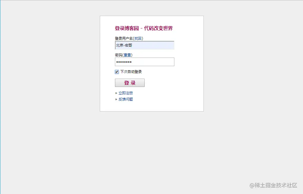 3、先打开博客园登录界面,手动输入账号和密码(勾选下次自动登录)