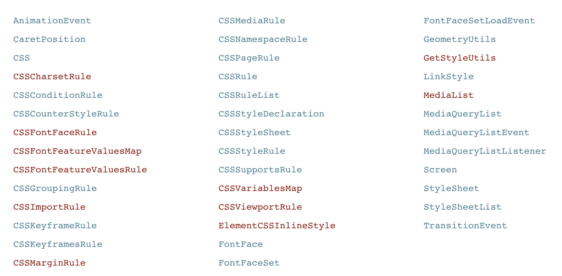 CSSCharsetRuleCSSConditionRuleCSSCounterStyleRuleCSSFontFeatureValuesRuleCSSGroupingRuleCSSImportRuleCSSKeyframeRuleCSSKeyframesRuleCSSMarginRuleCSSMediaRuleCSSNamespaceRuleCSSPageRuleCSSSupportsRuleCSSViewportRuleCSSFontFaceRuleCSSStyleRule