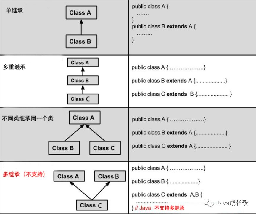Java 的继承是单继承,但是可以多重继承,单继承就是一个子类只能继承一个父类,多重继承就是,例如 A 类继承 B 类,B 类继承 C 类,所以按照关系就是 C 类是 B 类的父类,B 类是 A 类的父类,这是 Java 继承区别于 C++ 继承的一个特性。
