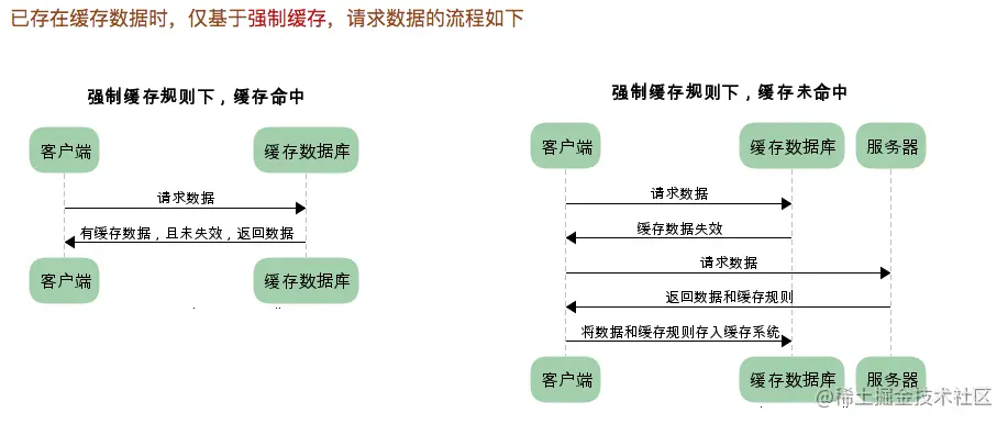 - 有缓存的话:不需要与服务器交互,直接从缓存数据库里拿