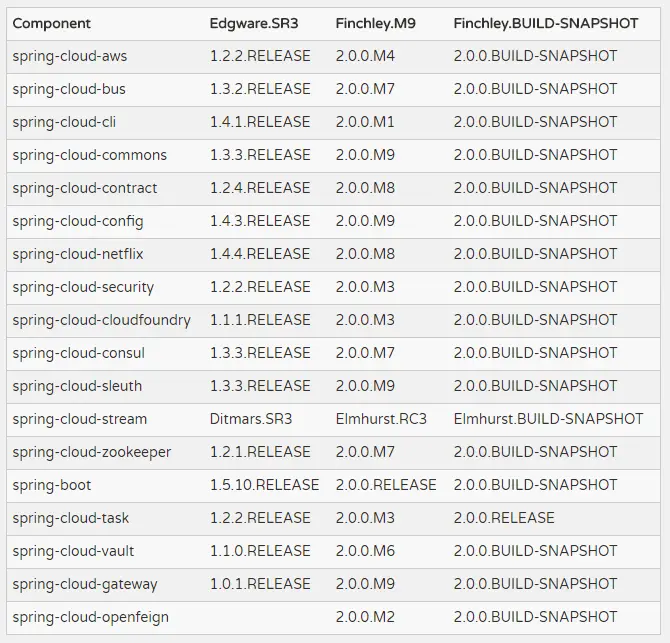 - Dalston 和 Edgware 是基于 Spring Boot 1.5.x 构建的,不支持 Spring Boot 2.0.x