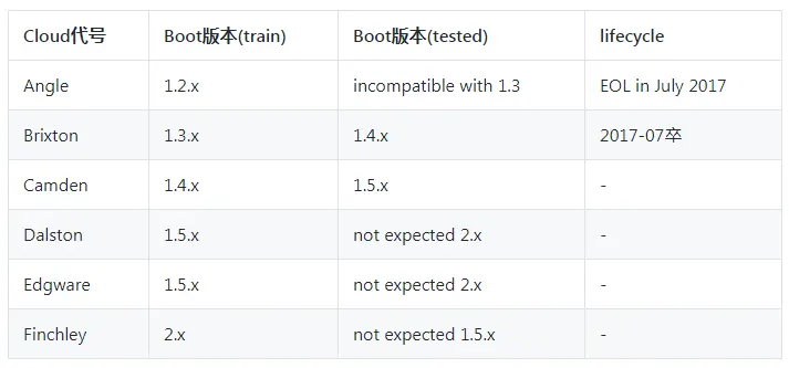 注意:Brixton 和 Angel 版本在2017年7月已经停止更新迭代了,我们就不关注它的版本依赖关系了。
