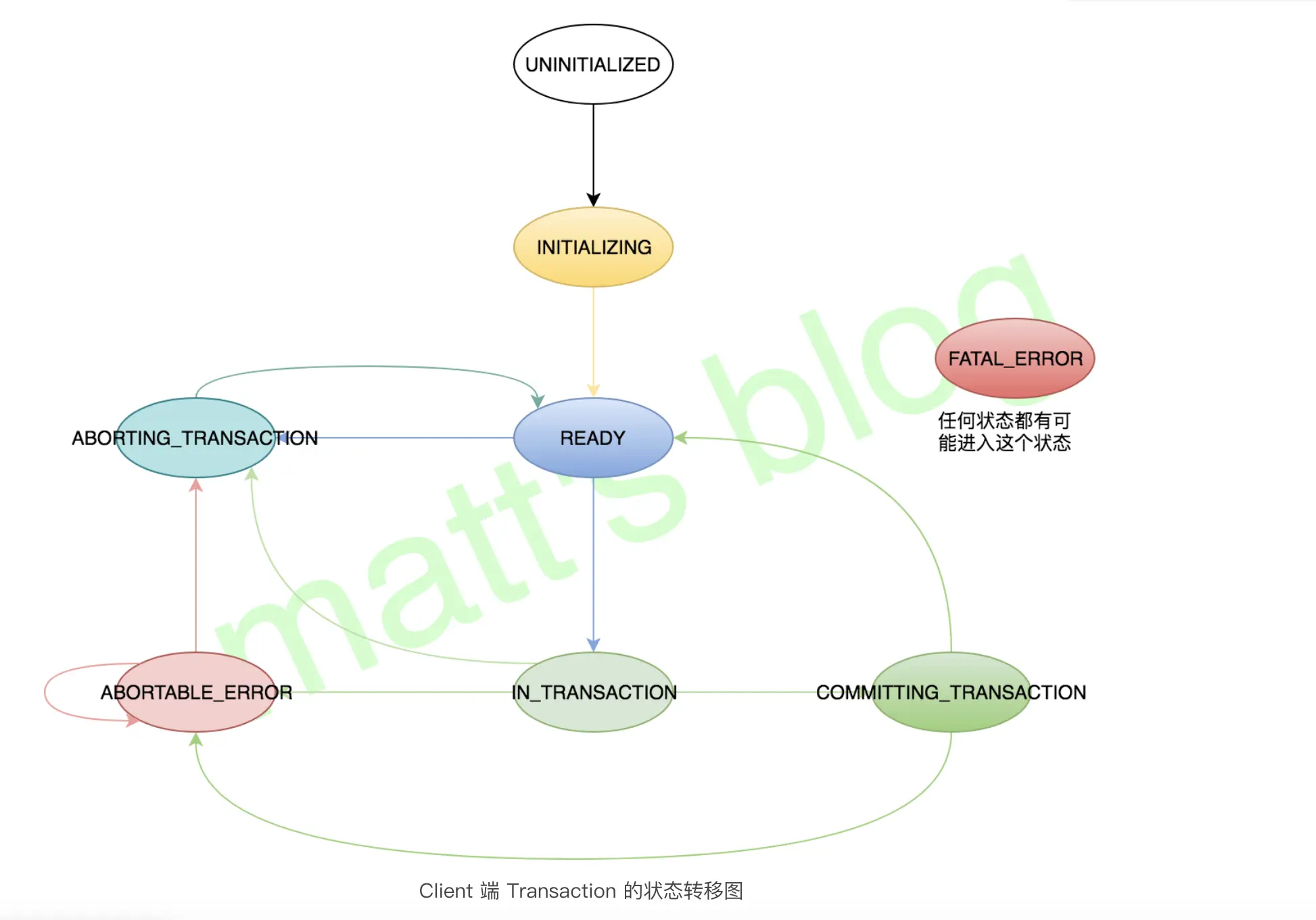 UNINITIALIZED:Transactional Producer 初始化时的状态,此时还没有事务处理; INITIALIZING:Transactional Producer 调用 initTransactions() 方法初始化事务相关的内容,比如发送 InitProducerIdRequest 请求; READY:对于新建的事务,Transactional Producer 收到来自 TransactionCoordinator 的 InitProducerIdResponse 后,其状态会置为 READY(对于已有的事务而言,是当前事务完成后 Client 的状态会转移为 READY); IN_TRANSACTION:Transactional Producer 调用 beginTransaction() 方法,开始一个事务,标志着一个事务开始初始化; COMMITTING_TRANSACTION:Transactional Producer 调用 commitTransaction() 方法时,会先更新本地的状态信息; ABORTING_TRANSACTION:Transactional Producer 调用 abortTransaction() 方法时,会先更新本地的状态信息; ABORTABLE_ERROR:在一个事务操作中,如果有数据发送失败,本地状态会转移到这个状态,之后再自动 abort 事务; FATAL_ERROR:转移到这个状态之后,再进行状态转移时,会抛出异常; Client 端状态如下图: