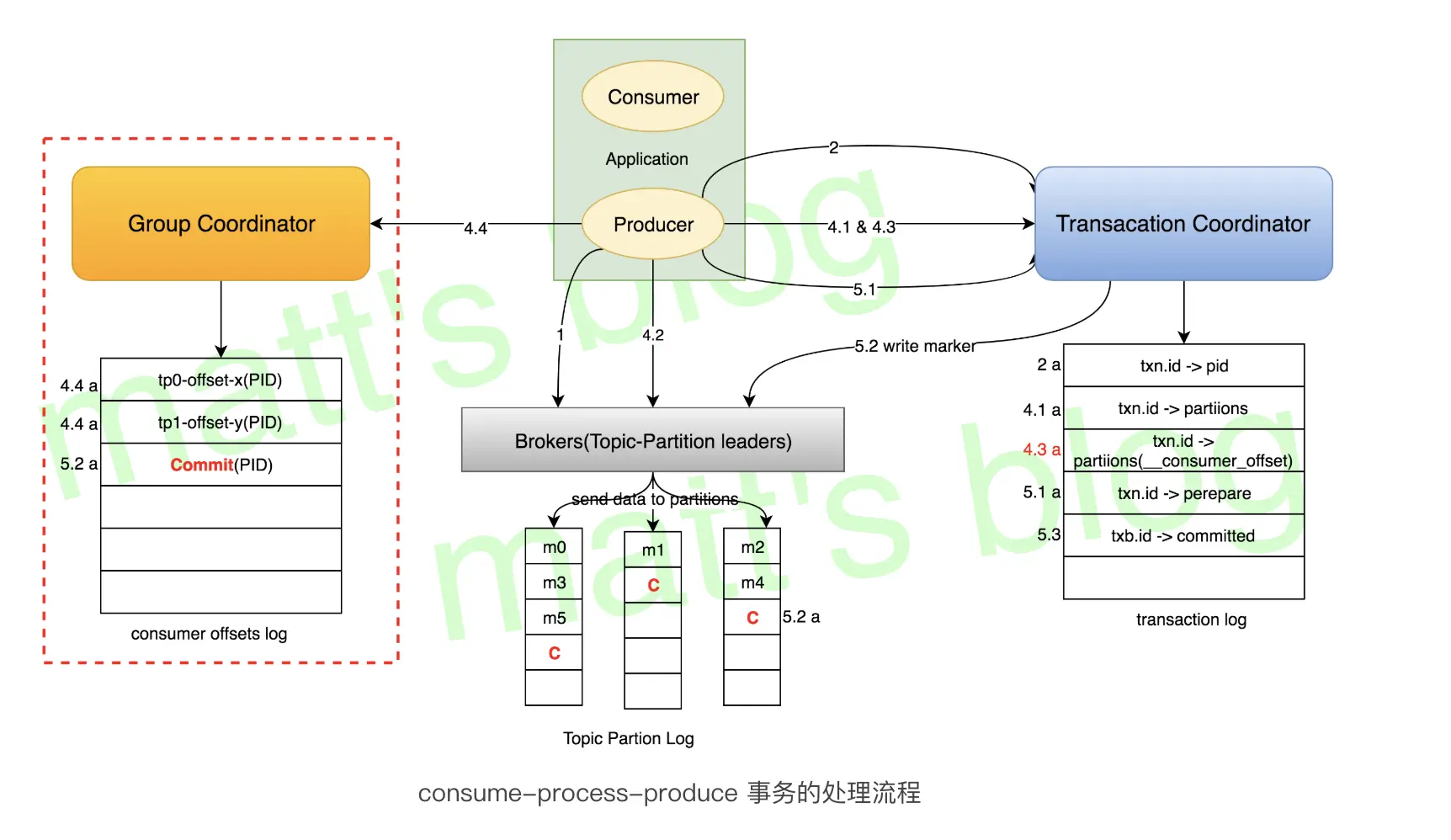 这个流程是以 consume-process-produce 场景为例(主要是 kafka streams 的场景),图中红虚框及 4.3a 部分是关于 consumer 的操作,去掉这部分的话,就是只考虑写入情况的场景。这种只考虑写入场景的事务操作目前在业内应用也是非常广泛的,比如 Flink + Kafka 端到端的 Exactly-Once 实现就是这种场景,下面来详细讲述一下整个流程。