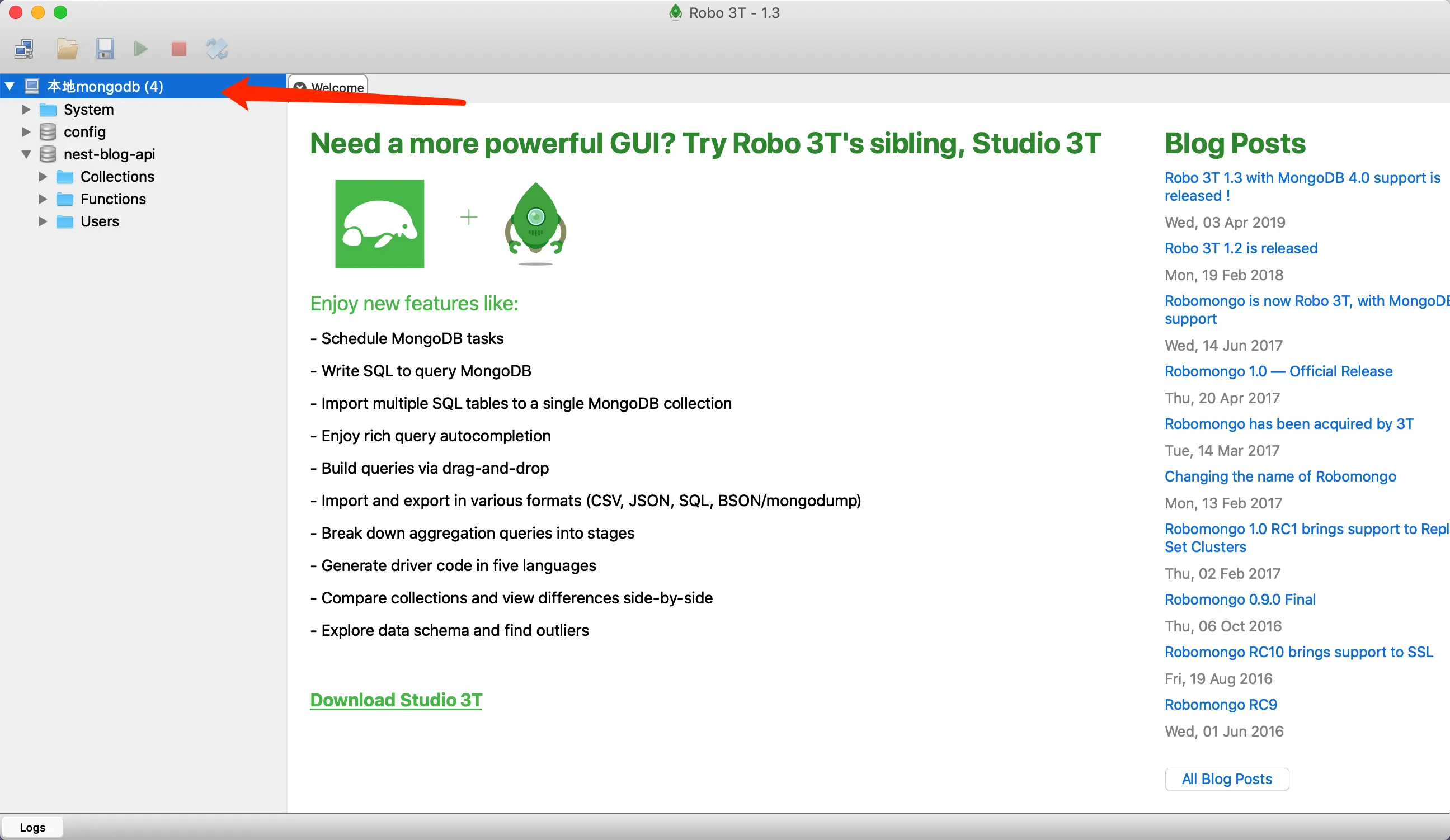 这样就可以愉快的使用mongodb了, 6.使用可视化工具连接mongodb 我使用的是Robo 3T,下载连接 打开工具的时候一定要启动mongodb,这样打开这个工具应该是这样的
