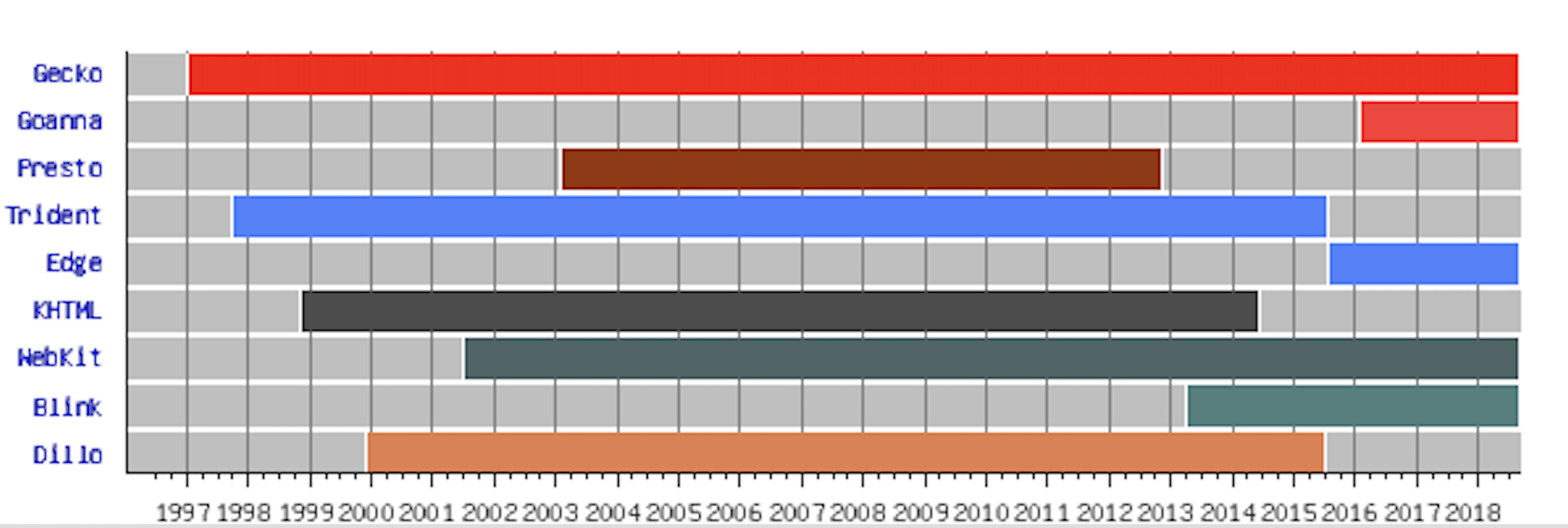 - 1998年,网景为了挽回浏览器大战的失败局面,成立 Mozilla 基金会。于1997年开始开发的 Gecko 渲染引擎一同被开源。