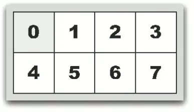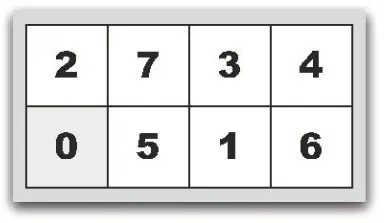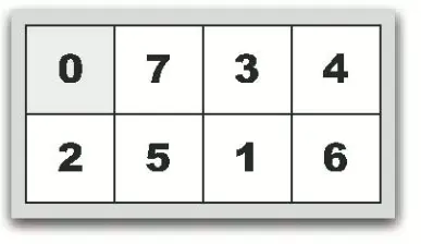 7 パズルは 8 つの正方形のカードとこれらのカードがぴたりと収まる枠で構成されています。それぞれのカードには、互いに区別できるように 0, 1, 2, ..., 7 と番号がつけられています。枠には、縦に 2 個、横に 4 個のカードを並べることができます。
