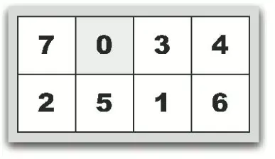 7 パズルを始めるときには、まず枠にすべてのカードを入れます。枠のなかで 0 のカードだけは、上下左右に隣接するカードと位置を交換することができます。たとえば、枠の状態が図(a) のときに、0 のカードの右に隣接した、7 のカードと位置を交換すれば、図(b) の状態になります。あるいは、図(a) の状態から 0 のカードの下に隣接した 2 のカードと位置を交換すれば図(c) の状態になります。図(a) の状態で 0 のカードと上下左右に隣接するカードは 7 と 2 のカードだけなので、これ以外の位置の入れ替えは許されません。