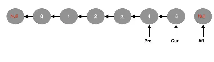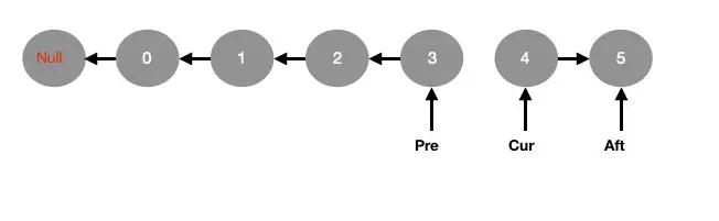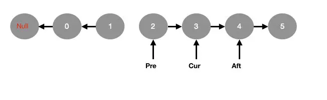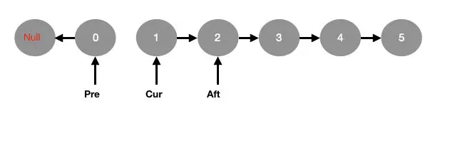 在上面链表删除第N个节点中我们加了两个指针解决了问题,那么接下来如果要反转一个链表该怎么做呢?两个指针已经不够用了,我们需要三个指针用来定义当前节点、当前节点的前节点、当前节点的后节点。当然这种方式是既不占用空间,时间也快的一种解法。