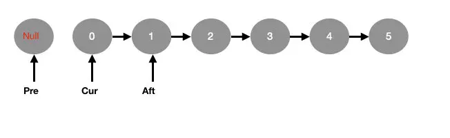还是我们定义的一个链表,那么我们想要的指针效果是什么样呢?接下来我们用图示一步一步演示怎么用三个指针将链表翻转过来,大家不用看我最后给出的解法答案,可以自己试着看着我的图自己写一遍代码,看能不能写出来。