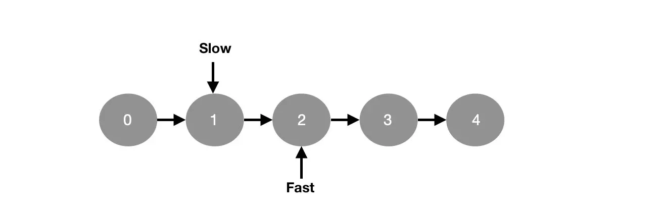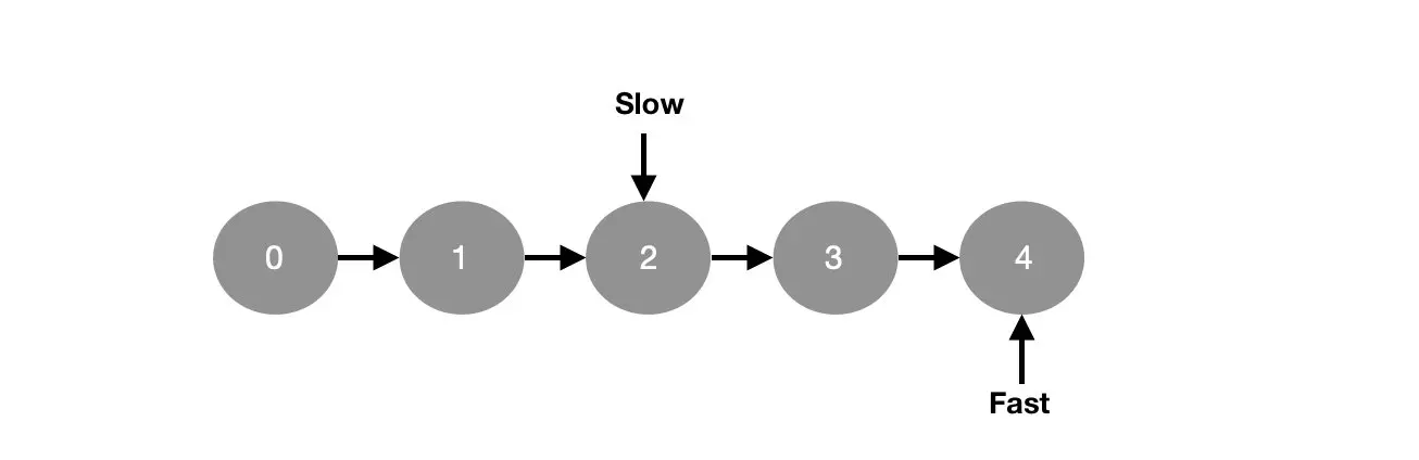 一般来说链表的题我们可以用指针的话无论是时间还是空间都是最优的解决办法,其实这里有个小技巧,就是定义两个指针(快慢指针),快指针每次走两个节点,慢指针每次走一个节点。这样当快指针走到最后的时候慢指针正好走到了中间位置。接下来我们用图更直观的感受一下指针是如何走的。大家可以按照图中的演示自己写一下代码,然后再看我最后给出的代码。这样会记忆更深刻