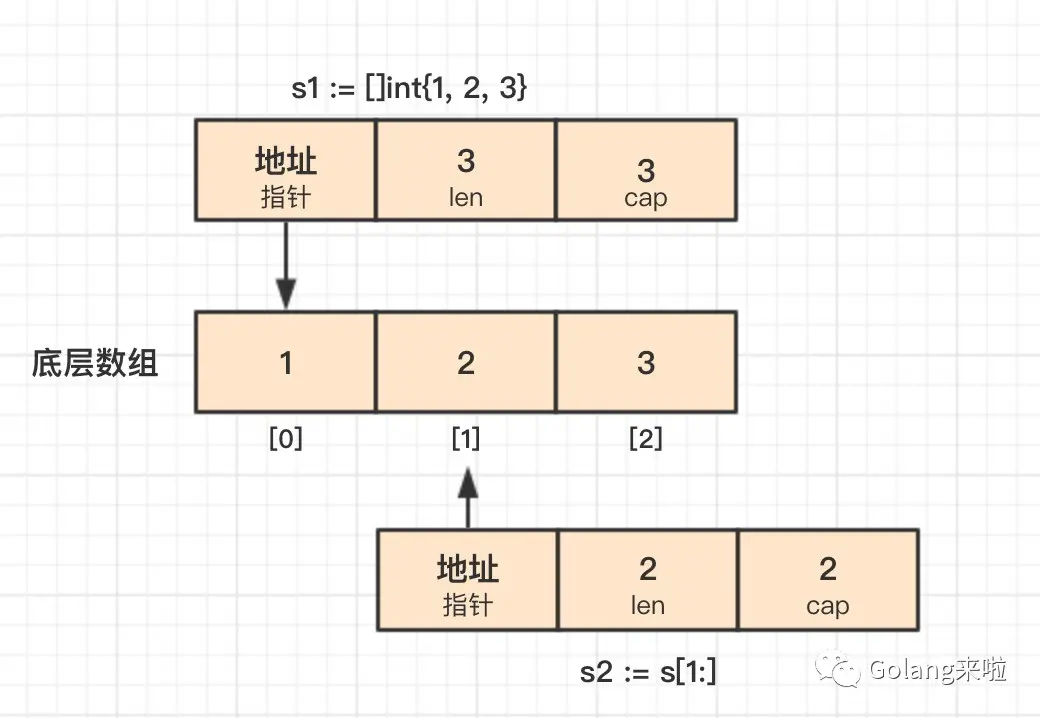 golang 中切片底层的数据结构是数组。当使用 s1[1:] 获得切片 s2,和 s1 共享同一个底层数组,这会导致 s2[1] = 4 语句影响 s1。
