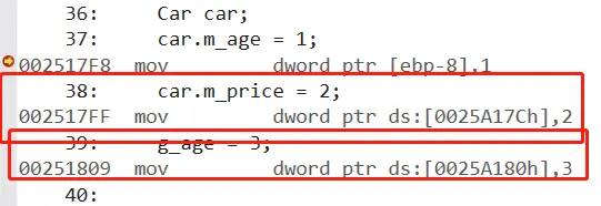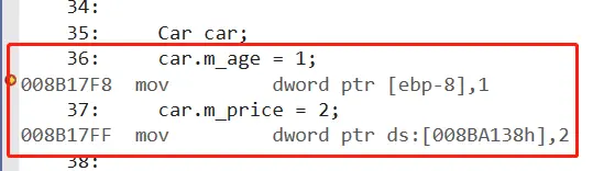 从汇编代码可以看到,首先是将1赋值到栈空间的一块地址,因为ebp是栈空间的一块地址值;接下来将2直接赋值到一块内存地址,并且是一块已经确定的地址值,而且看到,地址值前面有ds关键字,表示当前地址值是在数据段(date segment),而且如果现在定义一个全局变量,会发现生成的汇编代码格式是一样的