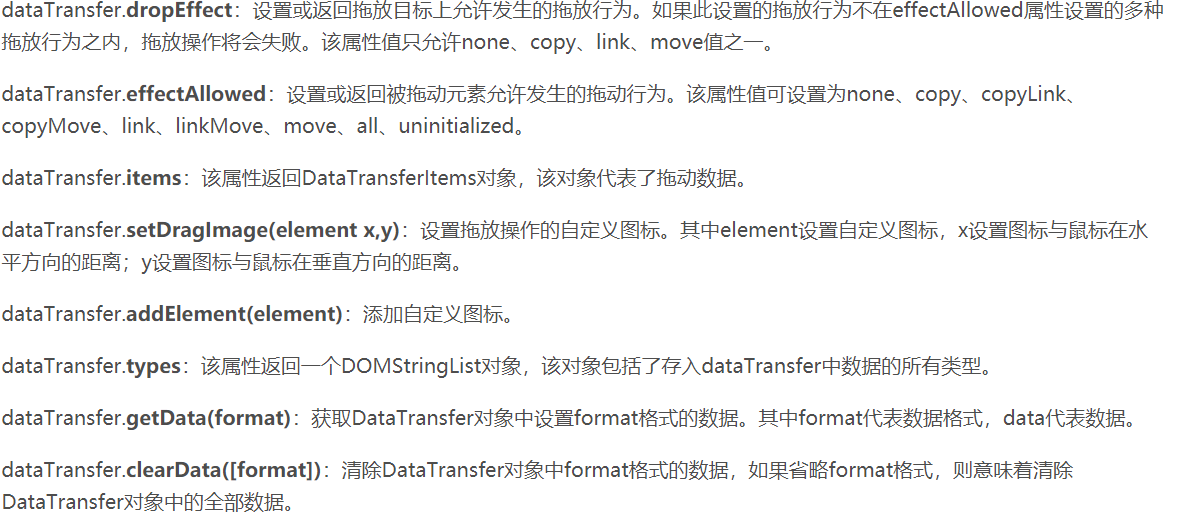 dropEffect属性只有搭配effectAllowed属性才有用,而effectAllowed属性表示允许t拖动元素的哪种dropEffect