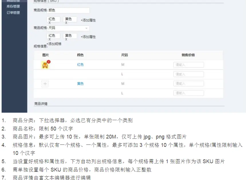 - 规格: 规格是动态的,是一个数组,数组长度的范围 1 <= array.length <= 3 , 可以对规格进行增删改