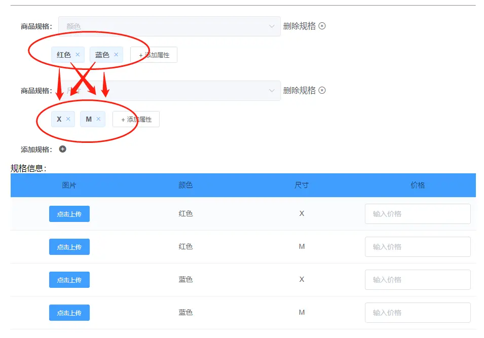当设置好规格和属性后,下方自动列出规格信息: 对每个规格的属性进行排列组合(可以了解一下笛卡儿积算法)