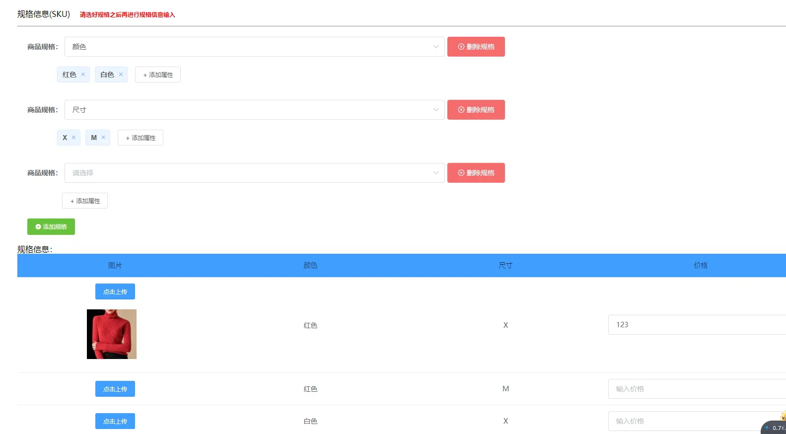 以上的思路实现了基本功能,可以使用但是用户体验比较差,比如规格选了之后不能修改,增加和删除规格属性的时候旧的规格信息都会被刷新等等