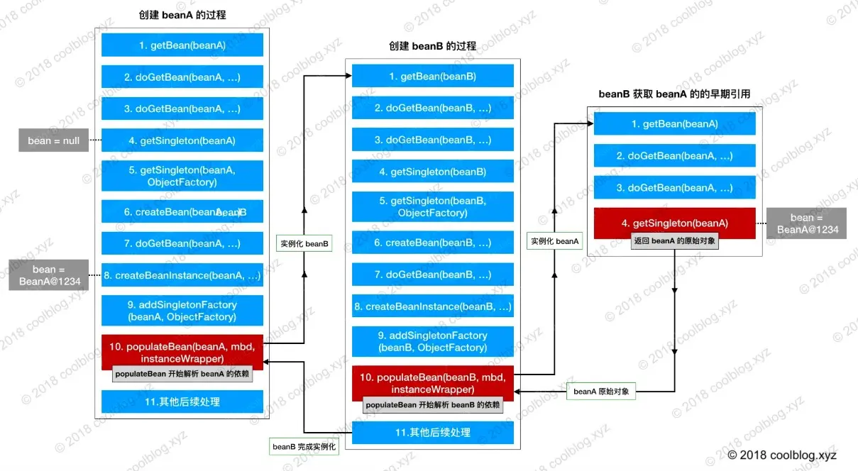 ` 在创建bean的过程分为三个部分,①、创建原始bean实例createBeanInstance,②、添加原始对象工厂对象到singletonFactories,③、注入属性bean。下面这张图是摘自别人博客