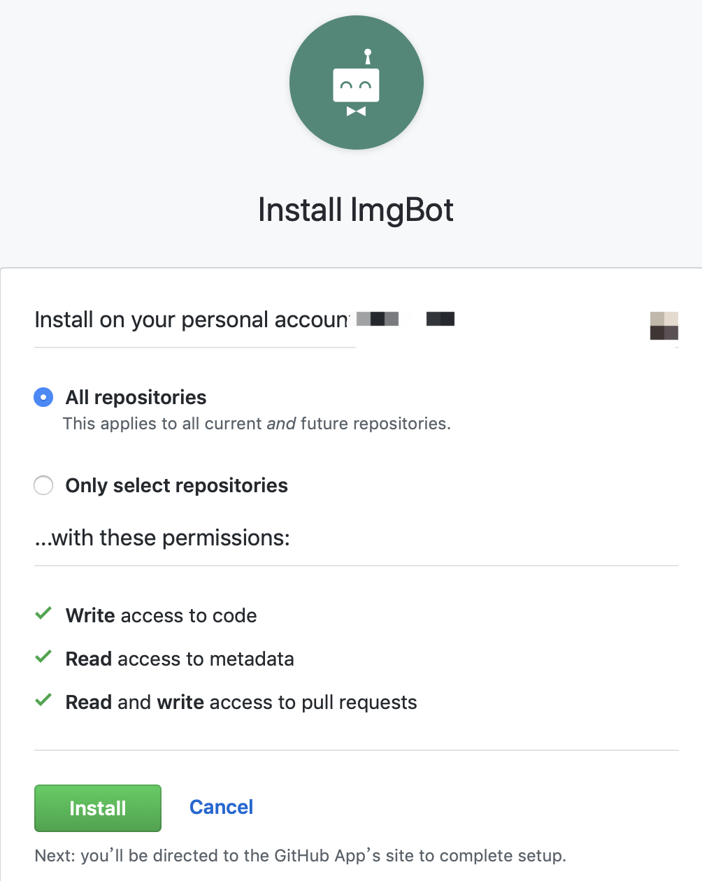 为 github 仓库安装 ImgBot 机器人。 打开 ImgBot 网站,点击 【try for free】, ImgBot 声称开源项目能够一直免费使用其服务。 从 ImgBot 网站跳转到 github 网站后,点击 【Set up a plan】 按钮,在下一步中选择 【Open Source】 这一个免费计划。下一步是【Install it for free】。 最后到这下图这个步骤,你可以选择为所有仓库开启此功能,也可以只选择为刚刚创建的图床仓库打开 ImgBot。