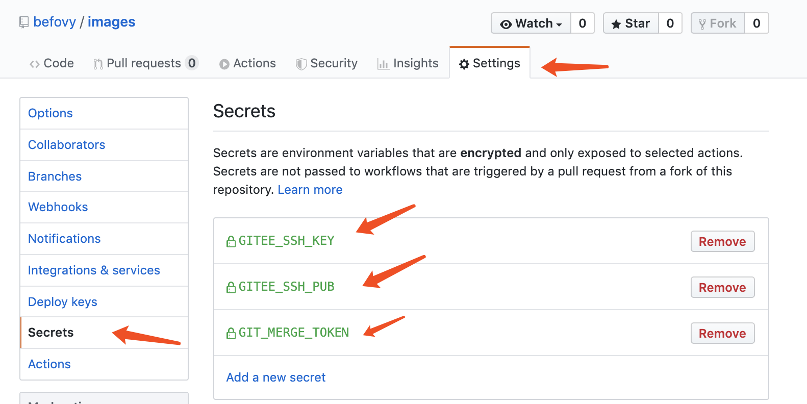我保存的名称分别是 GITEE_SSH_KEY 和 GITEE_SSH_PUB ,在 actions 配置文件中的使用方式是 ${{ secrets.GITEE_SSH_KEY }} 。
