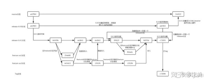- 若干开发分支,这个Feature分支和GitFlow,AoneFlow没有差别,在合入Release分支的时候进行CodeReview,我们固定叫feature-xxx