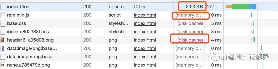 这种size大小不为0的请求,就是没有使用缓存。size是memory cache 和 disk cache就表示,浏览器并没有向服务器发送请求,而是直接读取了本地的缓存资源文件。